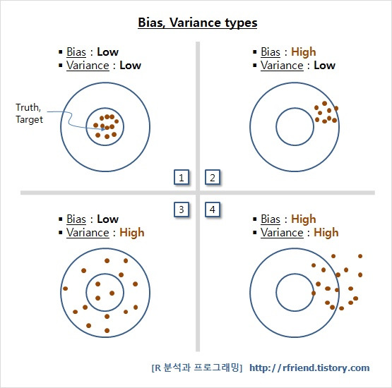 바이어스와 분산은 서로 트레이드오프(trade-off) 관계에 있다. 모델이 너무 단순하면 바이어스는 커지고, 모델이 너무 복잡하면 분산이 커지는 경향이 있다. 좋은 모델이란 이 두 요소 사이에서 적절한 균형을 이루는 모델이다. 결론적으로, 바이어스와 분산이 모두 낮은 상태(위 그림에서 1번) 즉, 정확하면서도 안정적인 예측을 하는 모델이 가장 좋은 모델이라고 할 수 있다. 이러한 균형을 찾기 위해서는 다양한 모델을 실험해보고, 모델의 복잡도와 데이터 특성에 맞는 구조를 선택하는 과정이 필요하다.
